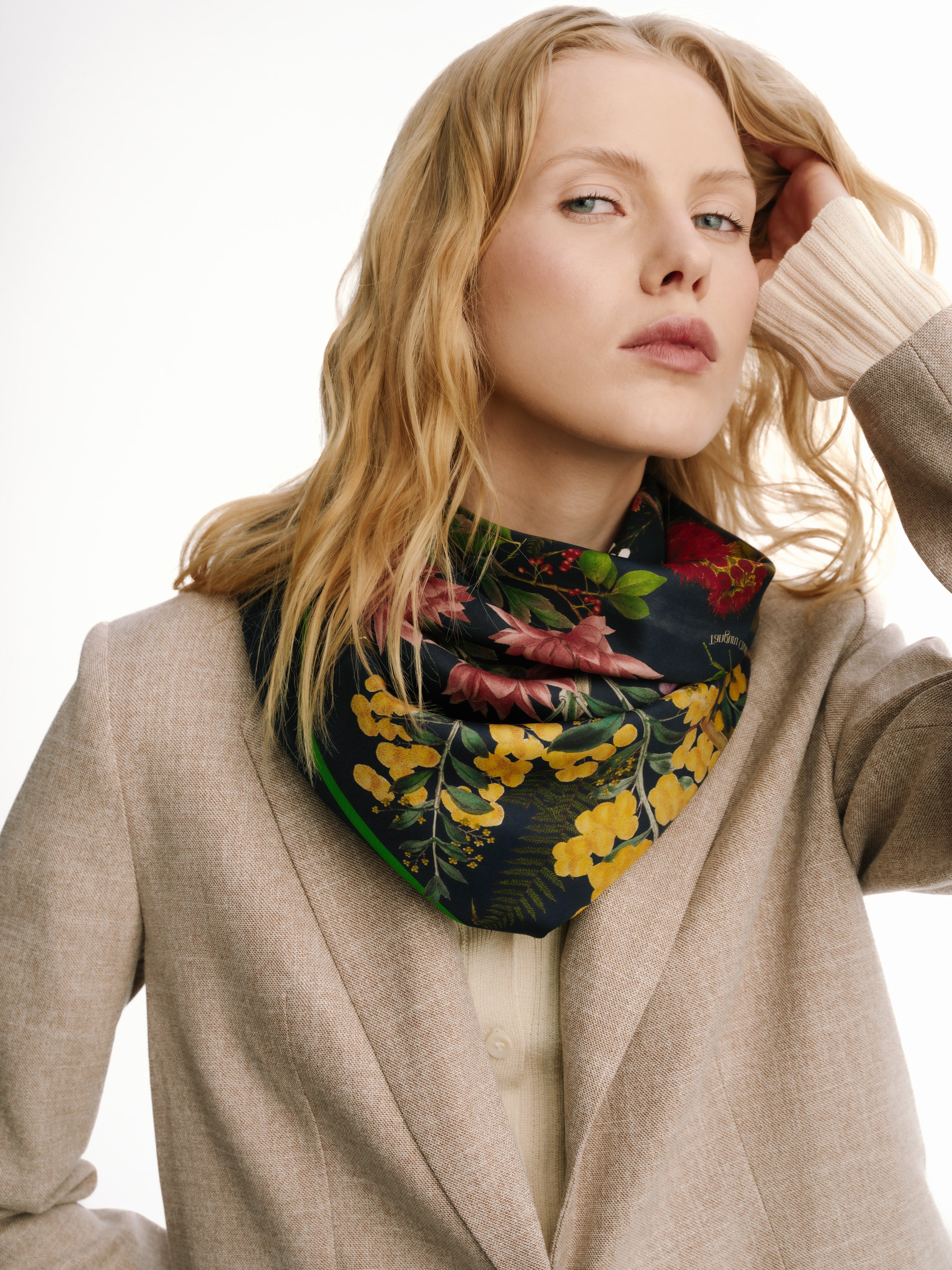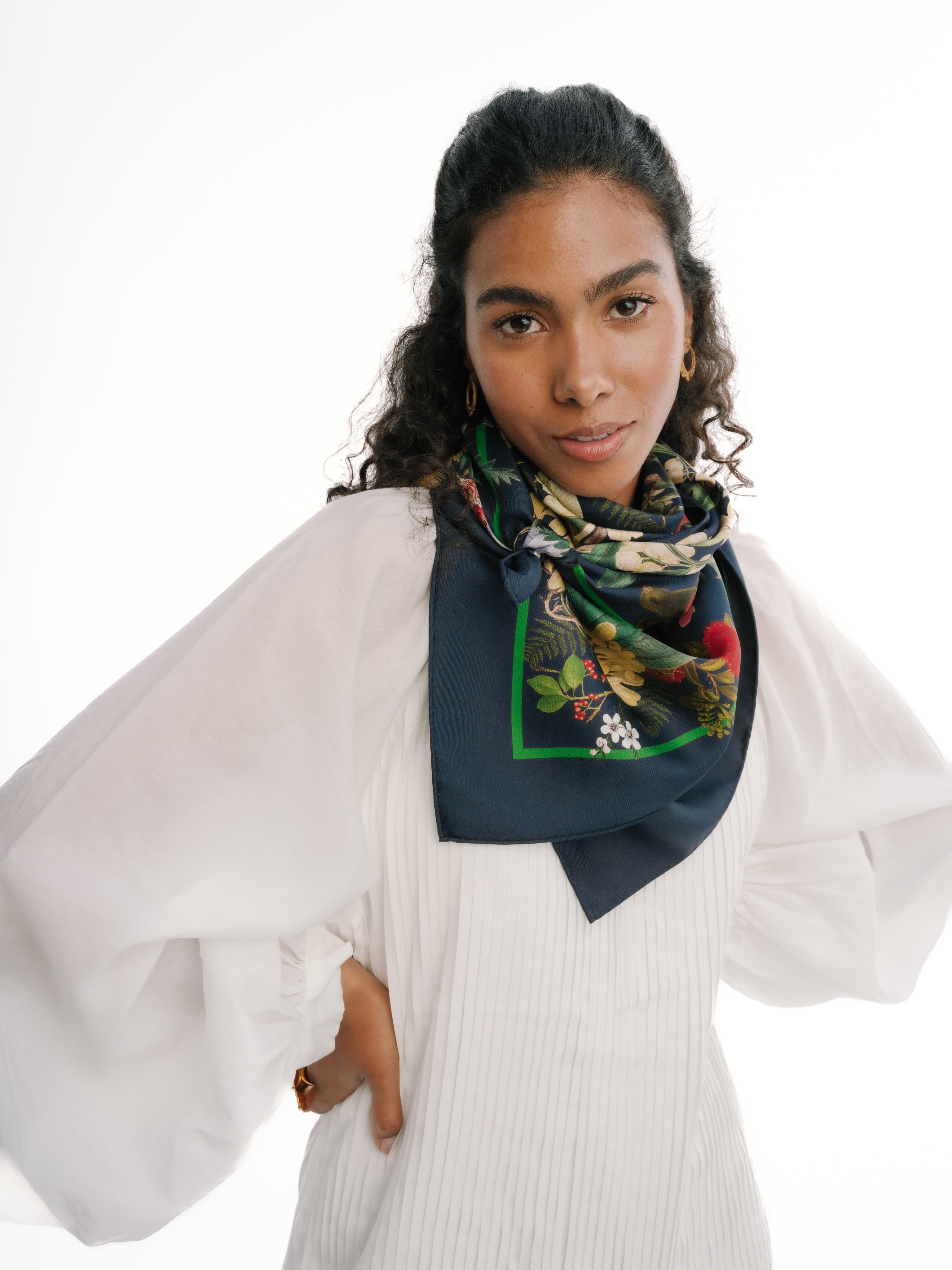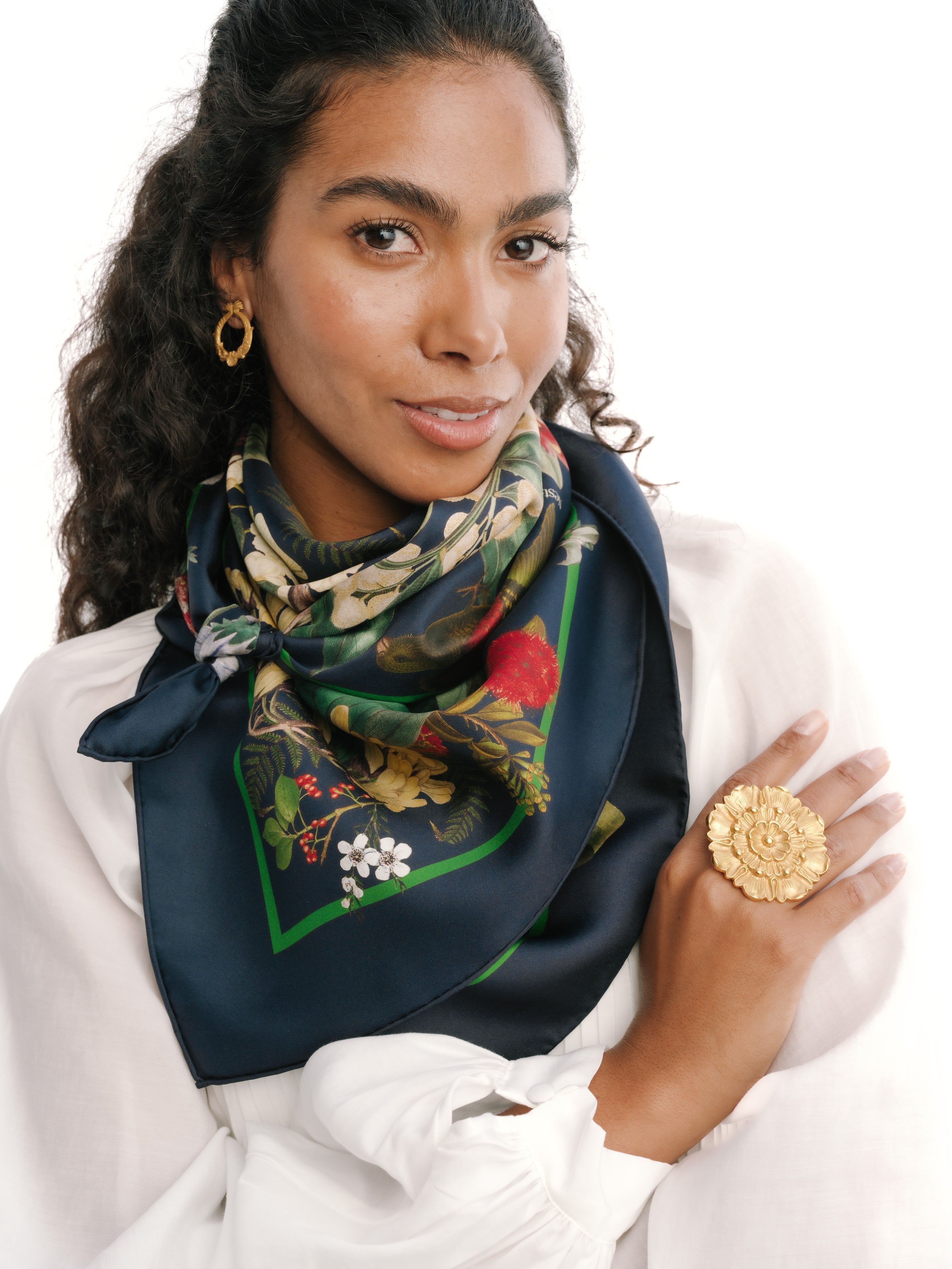 The Endemic Navy silk scarf depicts endemic species of Australian plants & New Zealand animals. Have a closer look at our luxury silk scarves designed by contemporary artists.